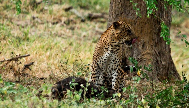 This was a great movement. This Wild boar carcass was under this tree when we went on our round in the morning and a croc was trying to eat. However in the evening when we got there this Leopard called HAMU who is known to be the biggest in the park was feasting.